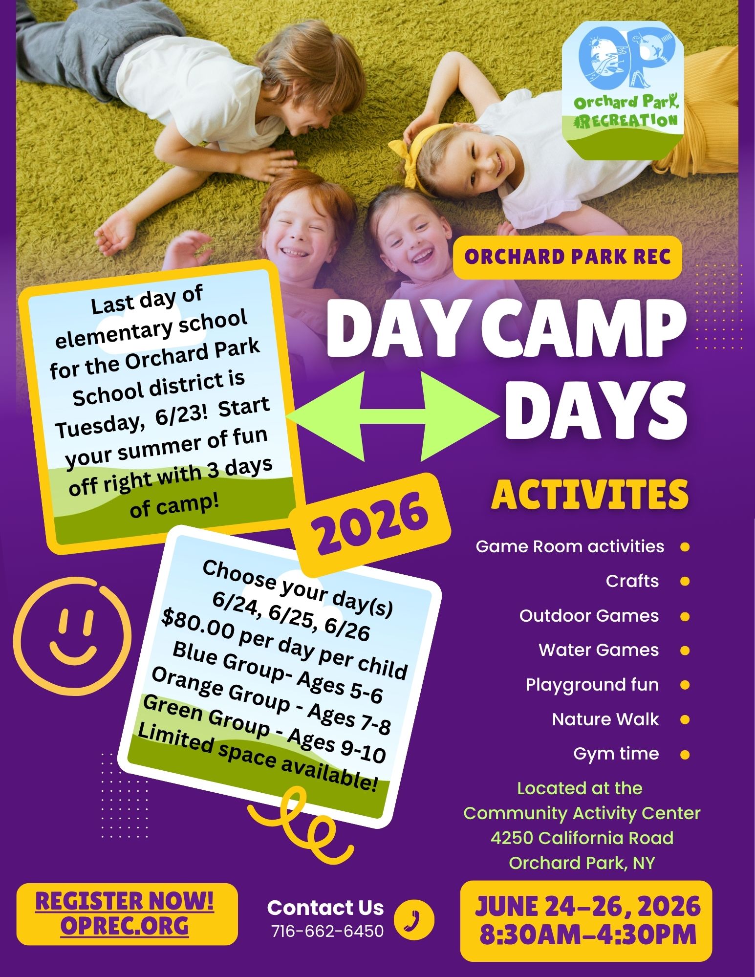 Last day of elementary school for the Orchard Park School district is Tuesday, 6/23! Start your summer of fun off right with 3 days of camp!!!