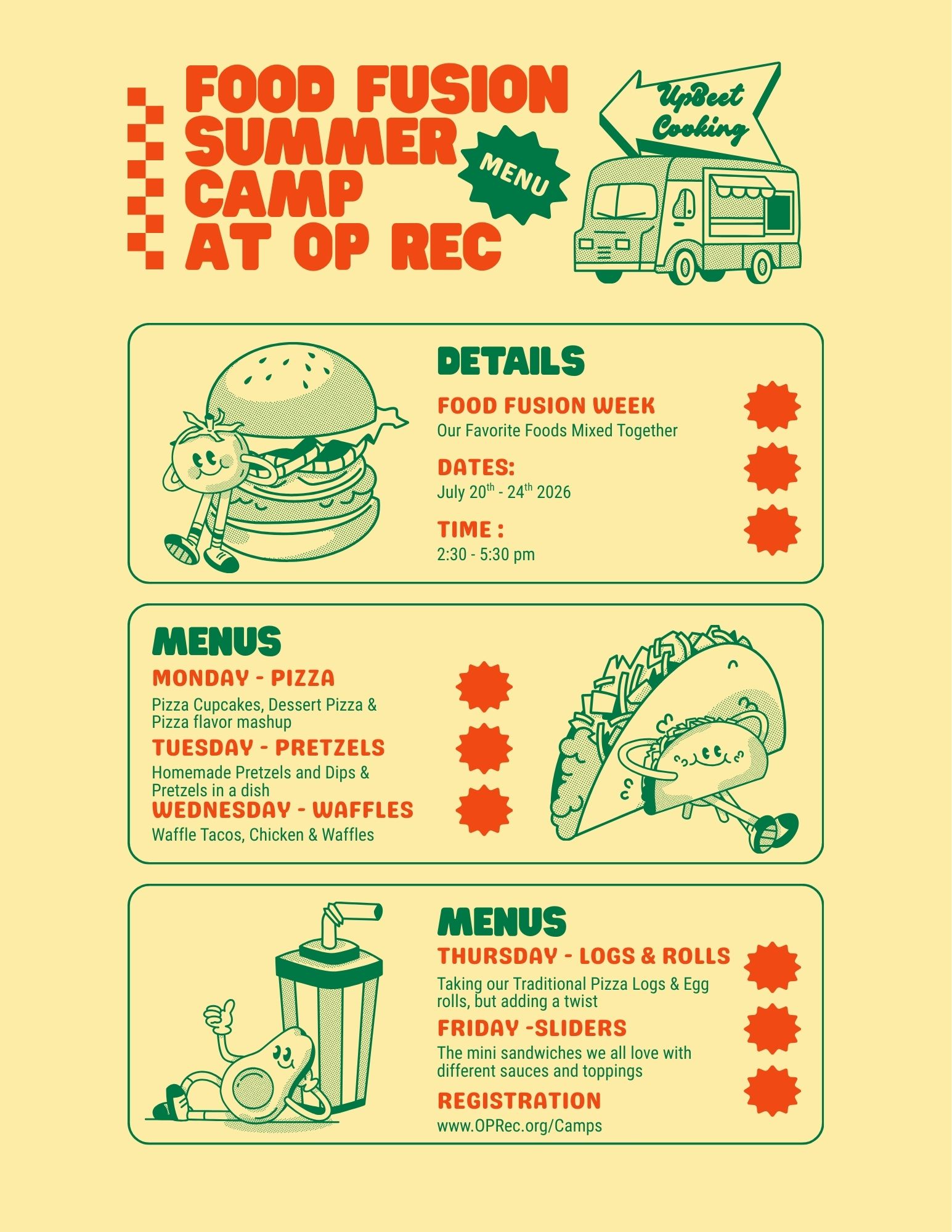 Culinary Camp will be led by Ms. Krista of UpBeetCooking! Each week has NEW recipes, NEW focus and NEW tasty things to eat! Held in our new Activity Center kitchen and workspace area, Campers will focus on culinary skills (knife handling, seasoning, food presentation, etc.) and practice by creating fun and tasty items. See the below description of each week for what to expect! Register today at www.oprec.org!